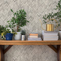 This generously scaled herringbone design replicates the look of natural fibers woven into the timeless pattern. Featured here in shades of grey and white. Ellery is an unpasted, vinyl wallpaper measuring 20.9 inches wide by 33 feet long, covering approximately 57.5 square feet per roll.