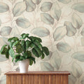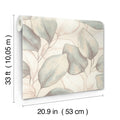 Two-tone vines with rounded leaves twine together in this oversized and highly detailed botanical design. The pale aqua and ivory leaves are brushed with metallic gold and bronze luster, the organic forms offset against a pale grey backdrop. Evanthe is an unpasted, vinyl wallpaper measuring 20.9 inches wide by 33 feet long, covering approximately 57.5 square feet per roll.