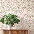 Delicate buds offer the first signs of spring along spindly, trailing vines. Inked in shades of periwinkle, pink, golden yellow, and spring green against cream. Romy is an unpasted, vinyl wallpaper measuring 20.9 inches wide by 33 feet long, covering approximately 57.5 square feet per roll.