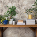 Two-tone vines with rounded leaves twine together in this oversized and highly detailed botanical design. The grey and ivory leaves are brushed with metallic silver and gold luster and are offset by a grey backdrop. Evanthe is an unpasted, vinyl wallpaper measuring 20.9 inches wide by 33 feet long, covering approximately 57.5 square feet per roll.