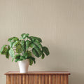 The texture of delicate, vertical ribbing is emphasized by soft color variations within a muted beige palette. Ewan is an unpasted, vinyl wallpaper measuring 20.9 inches wide by 33 feet long, covering approximately 57.5 square feet per roll.