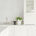 A striated texture gives this geometric wallpaper a hazy look, softening the normally hard edges of a honeycomb pattern. The cool-toned light grey is easy to style around. Aura is an unpasted, non woven wallpaper.