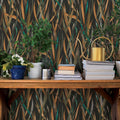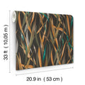 Thin, reedy fronds sway back and forth in this soothing botanical design. Featured here in a blend of green, orange, brown, grey, and vibrant teal against black. Willoughby is an unpasted, vinyl wallpaper measuring 20.9 inches wide by 33 feet long, covering approximately 57.5 square feet per roll.
