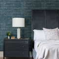This textural design is chic and dimensional. The rich blue hues are elevated by layering fabric textures over subtle navy scales. Samos is an unpasted, non woven wallpaper.
