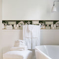 Vintage bath signs, soaps, and fresh towels give a warm and inviting ambiance to this country inspired border. Its charming style will go perfectly in a powder room. Country Bath is a prepasted, non woven blend border.