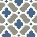 This large scale quatrefoil wallpaper has a bold style. The white, grey, beige, and navy blue design is perfect for a contemporary home. Lido is a non woven, unpasted wallpaper.