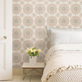 Blush, taupe and wheat medallions pop against a cream background in this playful wallpaper. With a design reminiscent to dreamy fabrics of Central Asia and the Middle East, this feminine wallpaper has a boho style. Priya is an unpasted, non woven wallpaper.