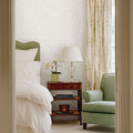 With a watercolor style, this geometric wallpaper has a unique and fresh look. Its light grey pattern weaves across a crisp white background. Ramble is an unpasted, non woven wallpaper.