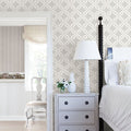 Adorn your walls with this sweet geometric floral design. Its grey hues pop against a white faux linen backdrop, creating a dimensional effect. Wynonna is a prepasted, non woven blend wallpaper.