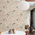 Fill your interiors with serenity and positive energy with this symbolic koi fish pattern. Each fish swims peacefully amidst beige lily pads and soft pink lotus flowers, the entire design enhanced by a faux linen texture. Nobu is an unpasted, vinyl on non woven wallpaper.