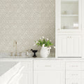 Pale seafoam and white brush marks are dotted across on a bone color background. A hidden harlequin pattern is revealed when viewed from afar. Blissful is an unpasted, non woven wallpaper.