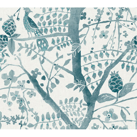 Pattern Peacock Block Print is an abstract bird and branch motif with a textured background inspired by woven linen.
